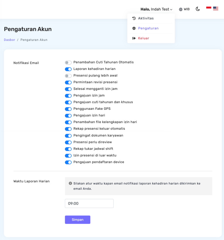 Anda dapat memilih notifikasi apa saja yang akan dikirimkan ke alamat email admin yang terdaftar dengan cara klik toggle dan mengatur waktu kapan laporan harian akan dikirimkan.