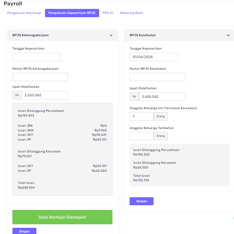 Isi data yang diperlukan seperti Tanggal Kepesertaan, Nomor BPJS, dan Upah yang Didaftarkan. Untuk BPJS Kesehatan, tambahkan juga Anggota Keluarga Inti (termasuk karyawan). Setelah semua terisi, klik Simpan; sistem akan menampilkan perhitungan otomatis beserta rincian iuran yang dibayarkan oleh perusahaan dan karyawan.