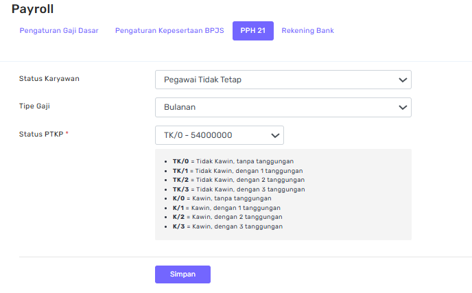 Pada bagian PPh 21, pilih Status Karyawan, tentukan Tipe Gaji, kemudian sesuaikan Status PTKP sesuai kondisi karyawan. Daftar keterangan PTKP tersedia di bawah sebagai panduan. Setelah semua data dipilih dengan benar, klik Simpan untuk menerapkan pengaturan